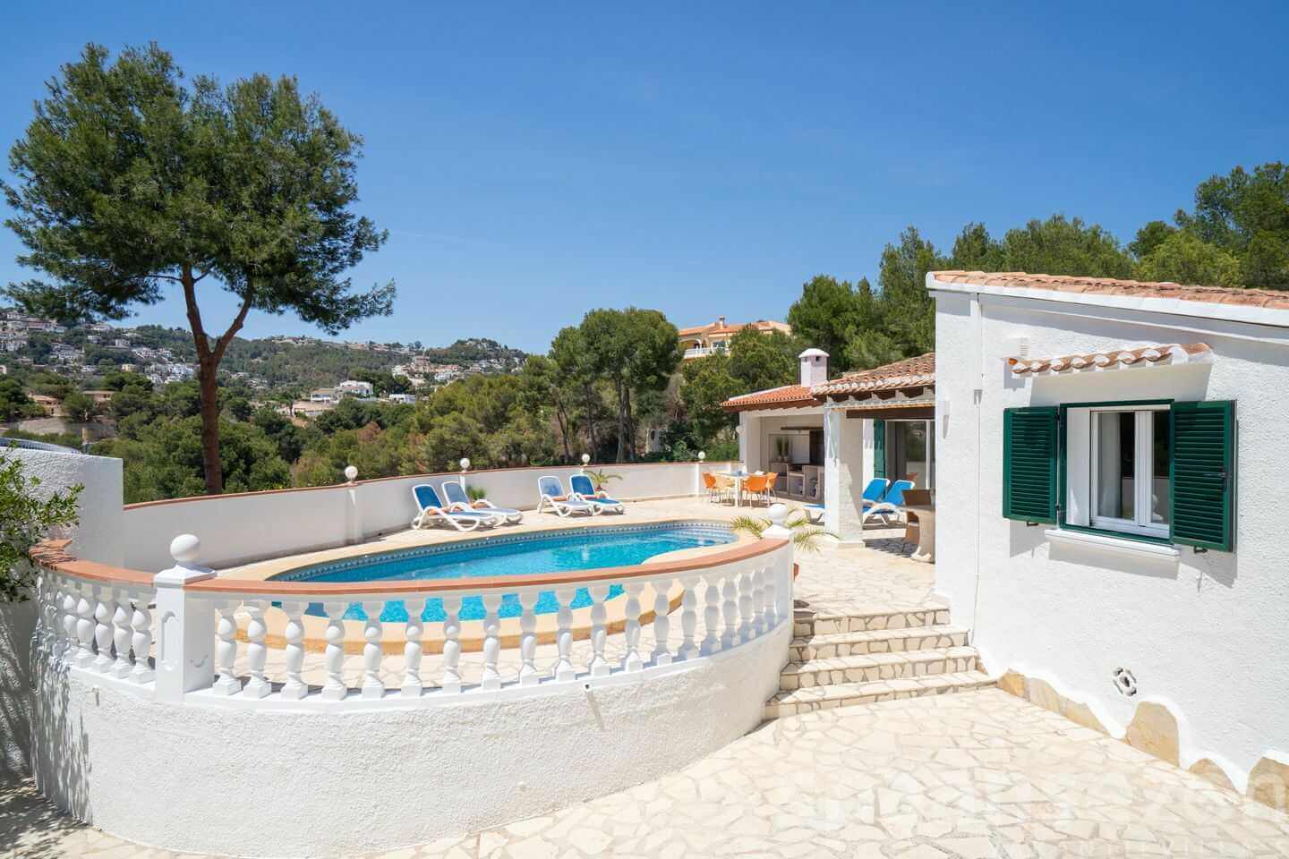 group1-6 personenshower3 Badkamer(s)bed3 Slaapkamer(s)wifiGratis WiFiac_unitAirco (warm/koud)poolPrivé zwembadbeach_accessValleizichtlocation_on3000m Centrumhome2 woonlagenMeer informatieVilla Naranja beschikt over een niervormig privézwembad, overdekt terras met loungehoek en buitenkeuken, en een ruime omheinde tuin met fruitbomen en dakterras. Rustig gelegen aan het einde van een doodlopende straat, met uitzicht op de golfbaan van Moraira. Supermarkt, strand en centrum liggen op korte afstand.